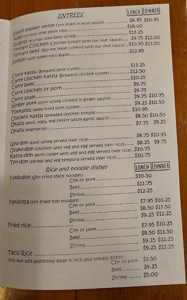 For those who love heartier options, the restaurant serves flavorful entrees like curry chicken, katsudon, and assorted bento boxes. Noodles are a staple, including house-made yakisoba, udon, and ramen. The prices range from $10 to $20, ideal for casual dining and sharing small plates with friends.